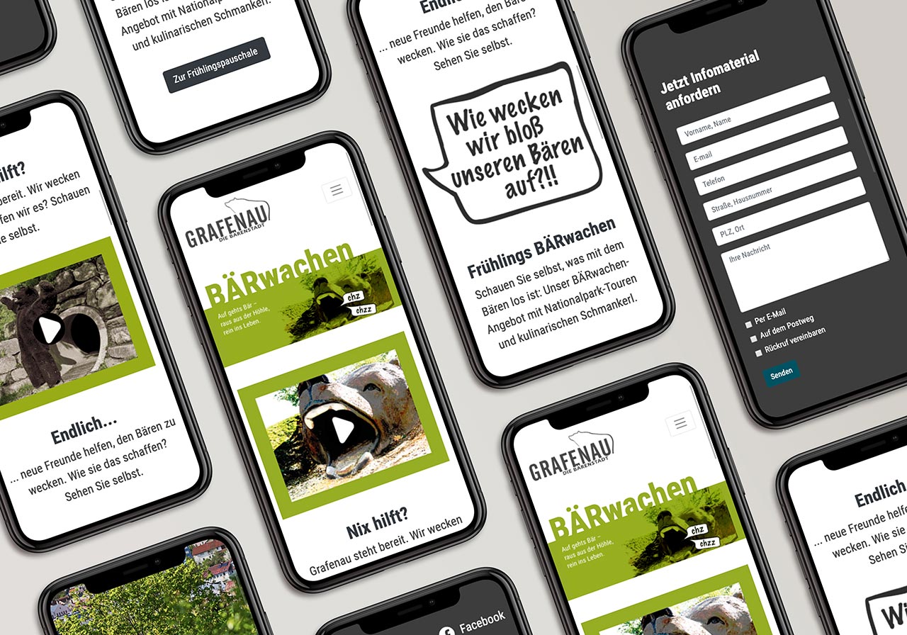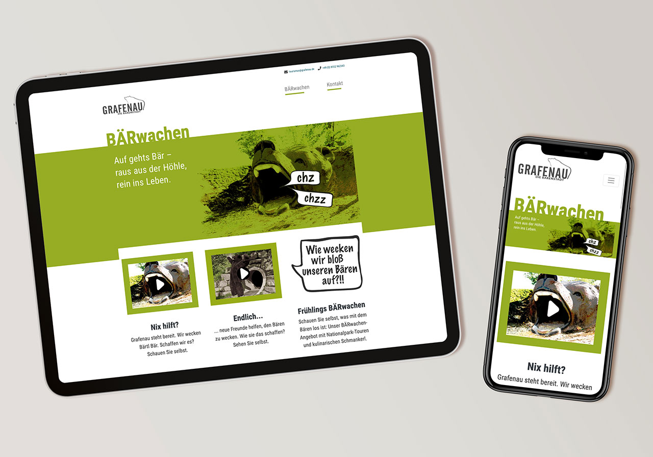 Durch die Corona Krise war der Tourismus in Bayern seit Monaten nicht mehr möglich. Die Stadt Grafenau unterstützt mit der Aktion “Da ist der Bär los” den Neustart der Tourismusbranche. Die Idee dahinter: Wie weckt man nur den Grafenauer Stadtbären auf? Auf der von uns entwickelten Website www.daistderbaerlos.de wird in witzigen Videos und mit Unterstützung der Hip-Hop Band Fichtenkartell versucht den Bären zu wecken. Die Microsite wird nach und nach mit “bärigen” Urlaubspauschalen erweitert.